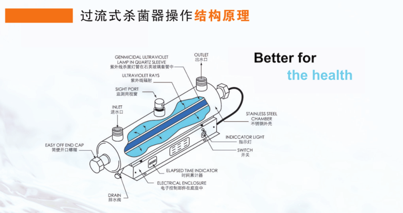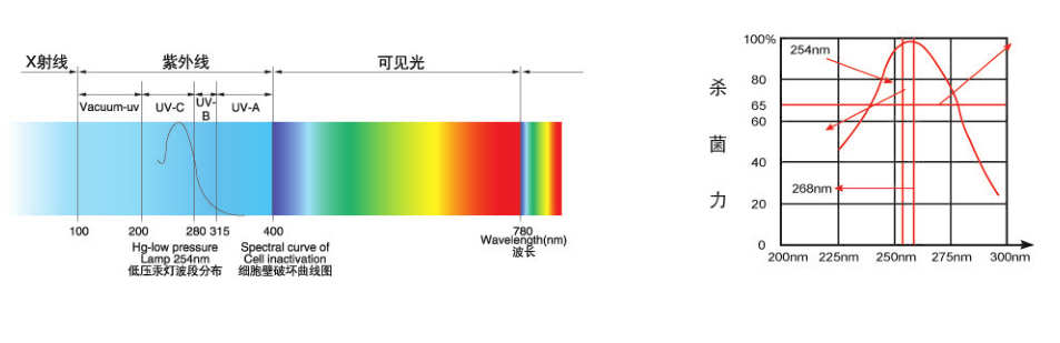 紫外線是介于可視光線和X射線之間的電磁波頻譜。200nm至400nm的紫外光譜有很強的殺菌效力, 其峰值在265nm。 在這個波長范圍內的紫外線主要是通過刺穿細胞膜,破壞細胞內脫氧核糖核酸和破壞細胞內的其它分子,使微生物不能再復制和繁殖,而最終達到消毒作用。 紫外線殺菌器實物拍攝依照波長范圍,可將紫外線分為4個波段: